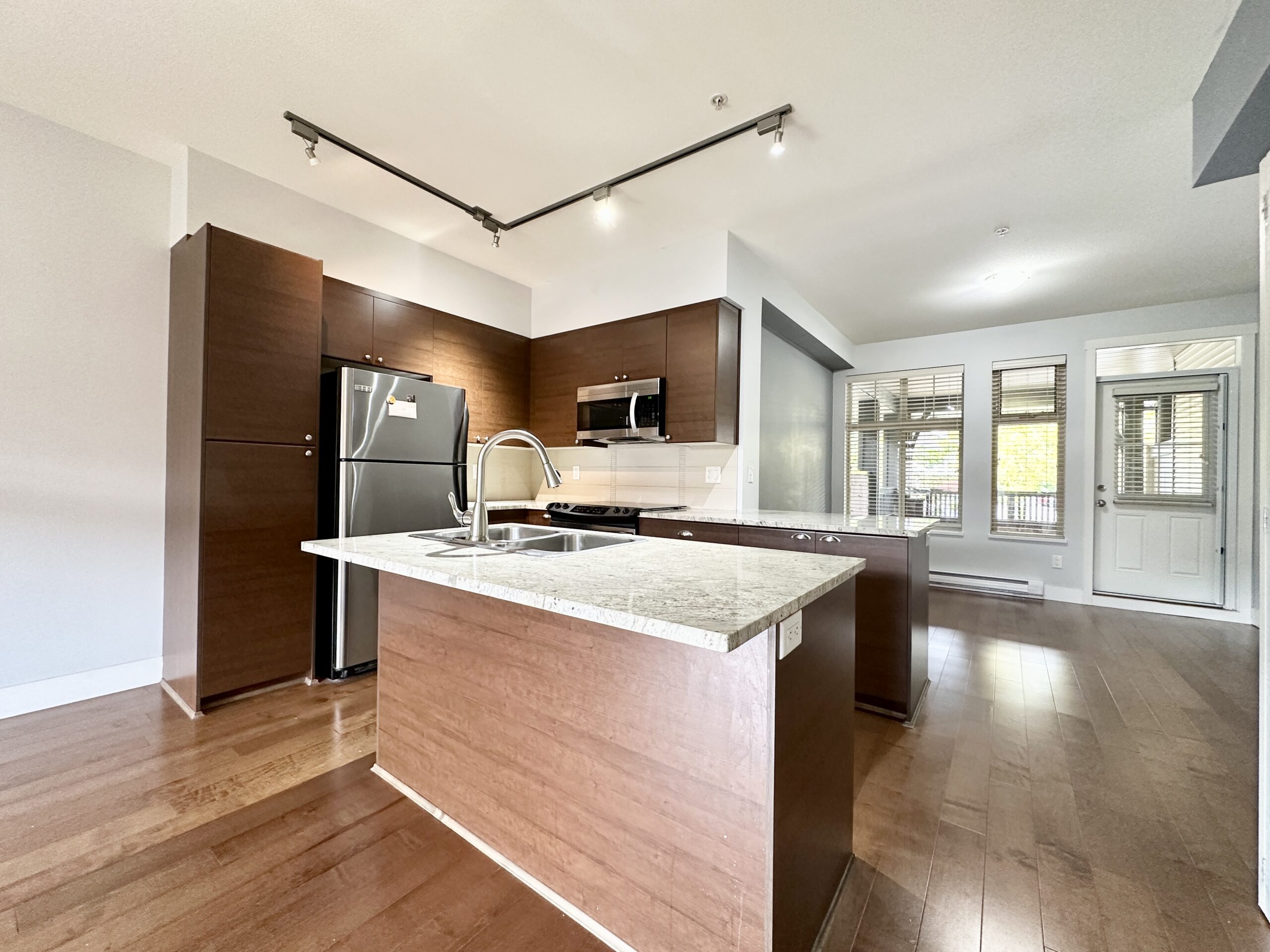 Welcome to Sunset Grove! This modern townhouse offers 1,071 sq. ft. of thoughtfully designed living space, featuring 2 bedrooms and 2 bathrooms. The bright, open-concept floor plan is enhanced by large windows, quality finishes, and stylish details throughout. The contemporary kitchen boasts a spacious island, quartz countertops, premium stainless steel appliances, and wide-plank laminate flooring. Step outside to enjoy a front patio and a large private patio in the rear, ideal for relaxing or entertaining. This home also includes two secure underground parking stalls and a storage locker. Perfectly situated within walking distance to Willowbrook Mall, cozy cafés, transit, schools, parks, and more—this home combines comfort, convenience, and modern living.
